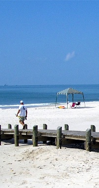 south of W. Beach Blvd. across from W. 13th St. The beach access has benches and a shower, but the